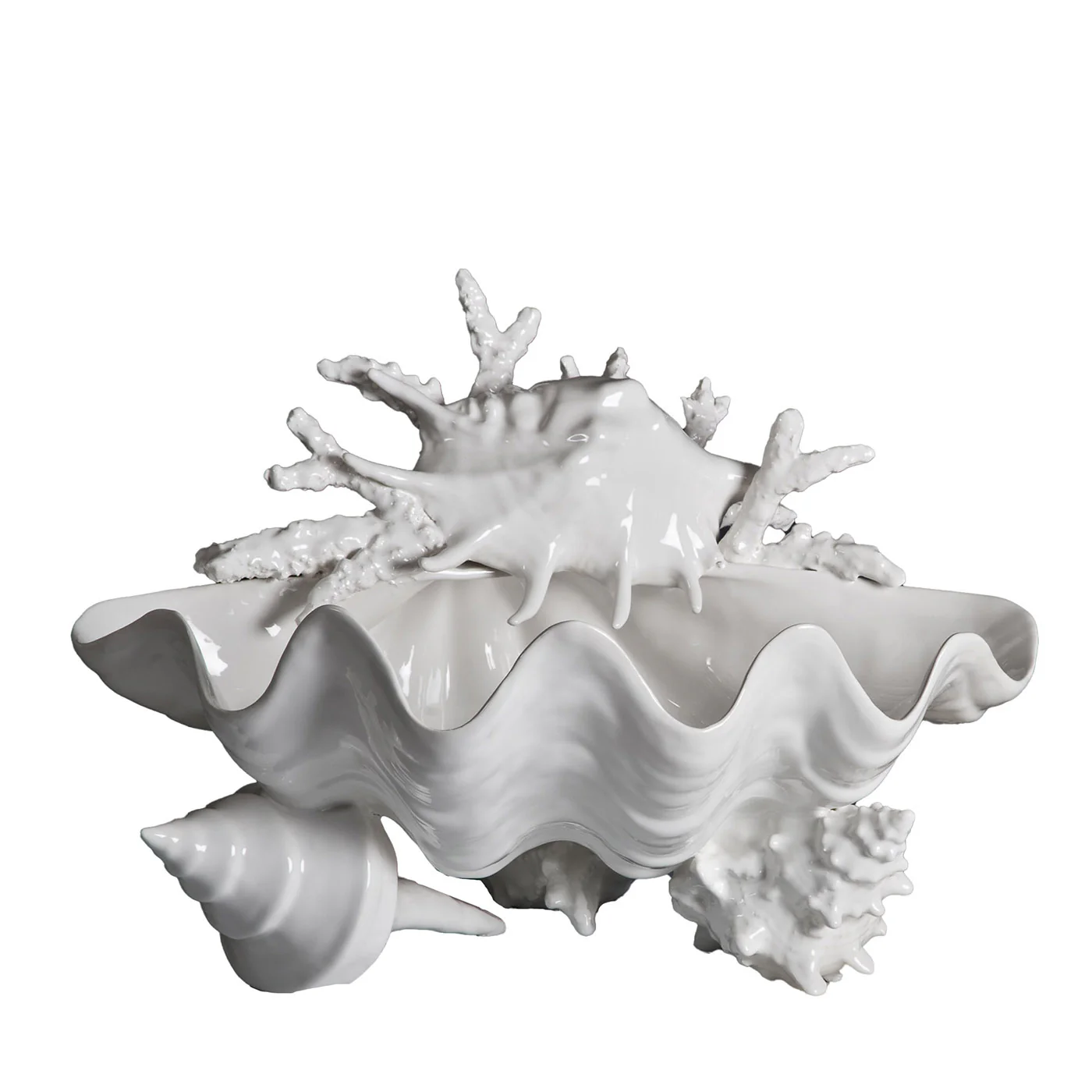 This item: Tridacna Large White Centerpiece Bowl$1,870.00$1,870.00Original price was: $3,281.00.$2,952.00Current price is: $2,952.00.This tridacna-shaped centerpiece bowl designed by Antonio Fullin will make for a sublime addition to tables set in refined coastal decors, domestic or contract, alike. Adorned with assorted sea shells at the base and top that are incorporated in its glossy, white-glazed ceramic body, it is a singular piece handcrafted following the Capodimonte pottery tradition. -